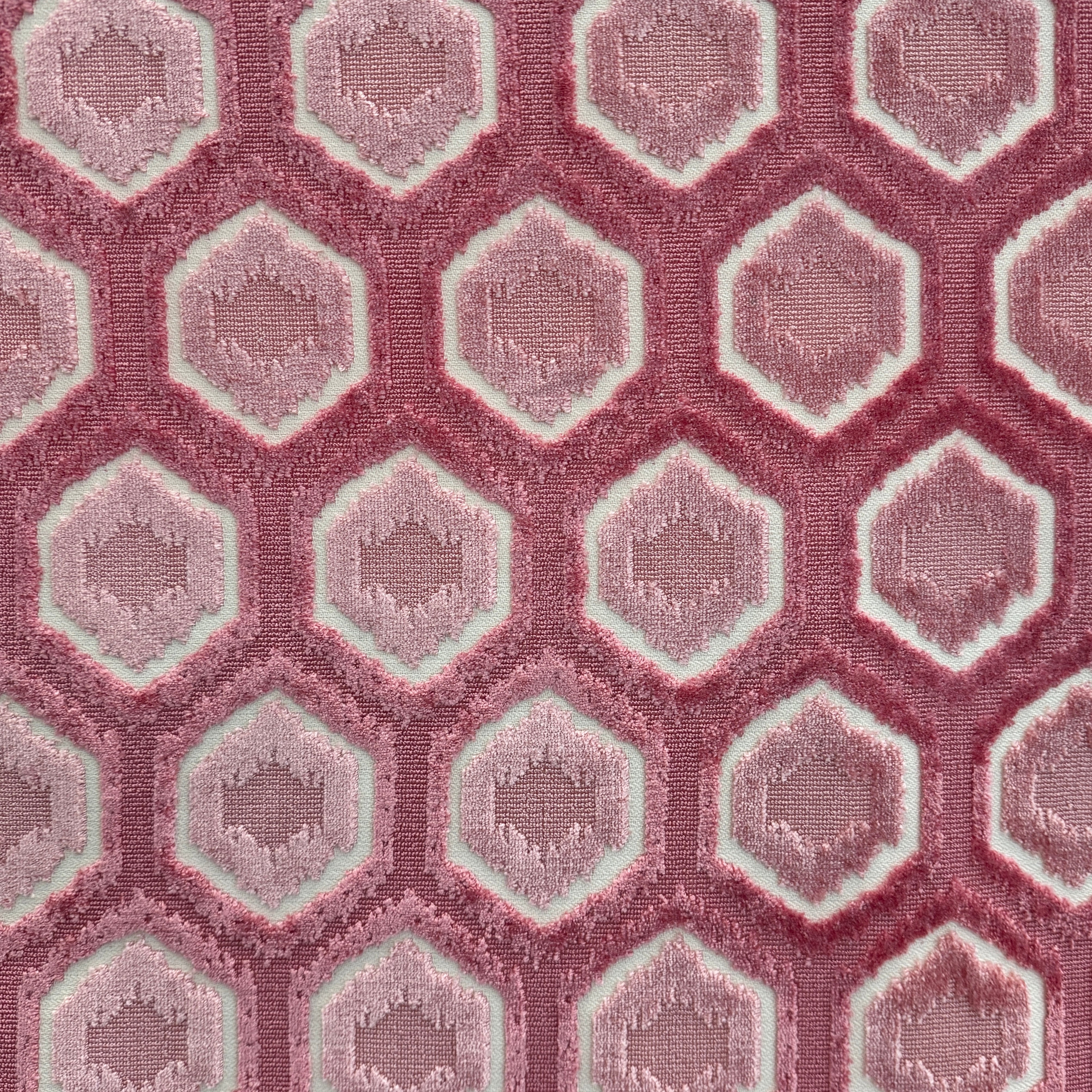Discover the charm of Ruggles, a playful raised velvet fabric featuring a lively hexagon pattern.